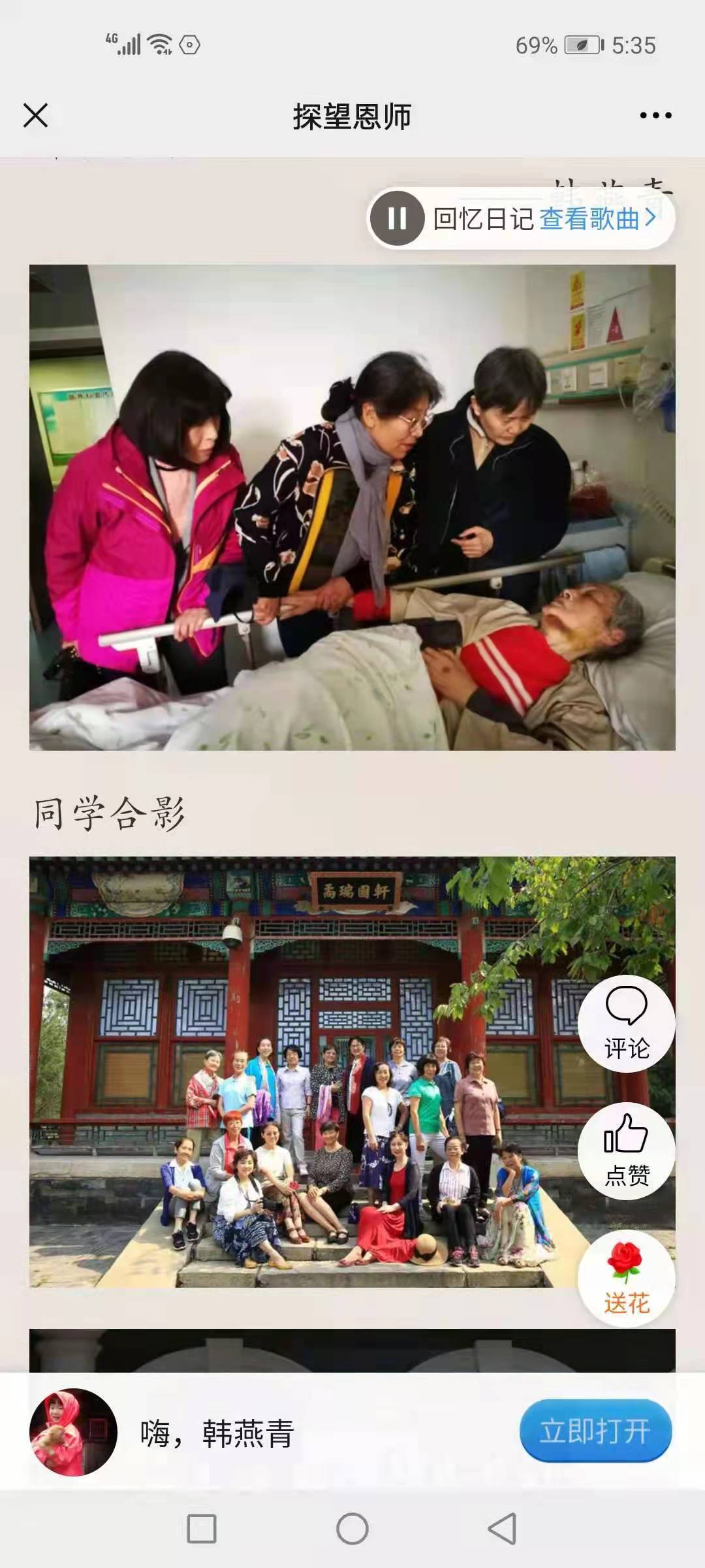 2019年3月1号,班群里说刘老师摔骨折了需要手术,现在已住在友谊医院,有空的时候去看看老师。次日方芳、李诗华、闫小红和我打算先去探望老师。