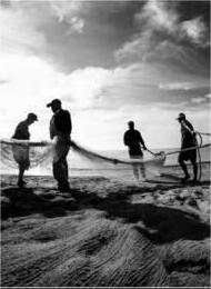 鱼终于被拉到海滩上,挣扎着蹦啊跳啊,作最后的一搏。人们扔了纲绳,全都跑到海滩,兴奋着往筐里捡鱼。