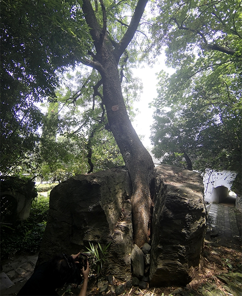 继续前行,一块裂开的巨石立于崖边,令人叹为观止的是裂缝里有一棵参天大树。传说这巨石还与岳飞有段故事。据史载,靖康、建言至绍兴初年,岳飞曾带兵经略江淮,驻扎过盱眙,并在山上操练兵马,以与镇守泗州的淮南节度使韩世忠呼应,扼守淮河,对峙金兵,伺机北伐。这块巨石下方有块开阔地,传说就是岳飞当年的练兵场。因奸相秦桧陷害,岳飞的兵马大元帅之职被革去。这时消息还没有传开,将士们依然在练兵场上杀声震天,意气风发,准备北伐,而岳飞却心痛如焚,他飞身站上巨石,悲愤交加,怒不可遏,猛一跺脚,犹如万钧铁杵砸在巨石上,巨石竟然裂开一道缝隙。四年后,南宋以十二道金牌诏回岳飞,被折磨致死,成了千古冤案。不知那一年那一天,一粒树籽飘落石缝,发芽生根,长成大树,并撑开巨石,成为奇观。