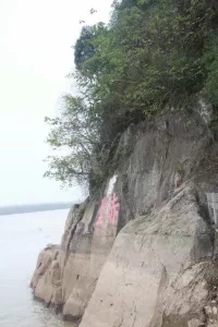 顺着赤壁矶头陡峭的石级往下走,矶下怪石嶙峋,峭壁上镌刻着斗大的“赤壁”两字。相传是周瑜破曹后,一时兴起,挥剑在石上刻下,故此地称之为“周郎赤壁”,是赤壁现存最早的文化遗迹。南宋诗人谢枋得在《赤壁诗序》中说:“予从江夏溯洞庭,舟过蒲圻,见石上有‘赤壁’二字,其北岸曰乌林,至今土人耕地,得箭簇长余尺,或得断枪折戟,其为周瑜破曹操兵处无疑。”明朝王奉偶过赤壁,题绝句两首于石上云:“赤壁横崖瞰大江,周瑜于此破曹郎,天公已定三公势,可叹奸雄不自量。孟德雄心实啖吴,皇天未肯遂其图,水军八十万东下,赤壁山前一火无。”洪武已丑年(1385年),曹君亭坐船到赤壁,发现宋明石刻,也留下了墨迹:“此乃周瑜破孟德之赤壁也,子瞻与后人但知黄州赤壁……。”赤壁二字之上,有唐代道人吕洞宾刻的“鸾”字,为道教符号。传说,为古战场增添了浓郁的浪漫色彩,也丰富了三国文化的内涵。
