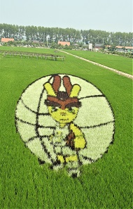 在另一座小塔上,我们也看到了两幅画面,一幅名为《二师兄》。二师兄,当然就是猪八戒了。只见八戒头戴僧帽,两耳扇风,长鼻咧嘴,腆胸叠肚,两手伸向前方,做出欲搂抱之状,似乎嘴里叫着:“女施主,你长得可真漂亮呀!”把一个贪恋女色的猪八戒表现得淋漓尽致。但是,遗憾的是,由于水稻的颜色搭配不当,这幅图画有些层次不清。小塔旁另一幅图,是2019年国际篮联篮球世界杯吉祥物“梦之子”的形象。梦之子在2015年8月8日出生于中国,他通过神奇的犄角可以预见未来,在球场上比任何人都拥有更快的移动速度。2019年国际篮联篮球世界杯将于8月31日至9月15日分别在中国北京、广州、南京、上海、武汉、深圳、佛山、东莞八座城市举行。稻田画《世界杯吉祥物“梦之子”》表示将用一场酣畅淋漓的大胜来宣告新时代中国男篮的决心和信心。