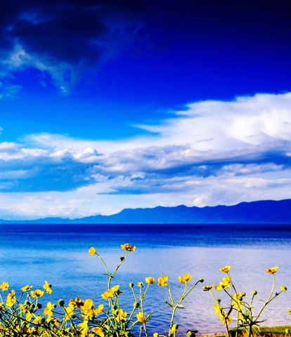 半山坡上,蒙古人搭建的毡包旅馆,错落有致,没有一点刻意的布局,却与这环境是那么协调,那么恰如其分。暖霞与夜间凝聚的冷气相撞生出的雾瘴,云蒸霞蔚,使人顿生脚踏祥云之感,寓神仙云游之情。湛蓝的湖水如一块巨大的蓝田碧玉,无瑕而静默。白云悠悠地倦卧在了湖底,湖蓝的水色又晕染向天空,一望无垠,直到归隐在水岚迷漫的天边。炊烟若雾裹挟着毡房里飘出的奶茶香气,萦绕在湖的上空久久不肯散去。