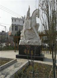 北侧广场中央,安放的是一座明代开国元勋常遇春骑骏马征战的汉白玉雕像。雕像的上部,主帅常遇春头戴金盔,身披铠甲,虎目圆睁,凝视敌方;左手带疆,右手执剑,身披战袍,迎风皱褶;座下跨骏,奋蹄跃起,引颈长啸。仿佛把我们带到了元末红巾军起义的战场上,但见主帅常遇春气贯长虹,指挥若定,正统领千军万马与敌人激战的恢宏场景。雕像底座用黑色大理石砌成,高一米左右。底座南侧居中标注的是“明﹒开平王 常遇春1330-1369”字样。底座北侧刻有常遇春事迹简介。楷体镌刻,金色描注,端庄清晰,阅读简便。雕像北侧还建有一道木质透空长廊,东西长约二十米,本色制成,朴实无华,为雕像的背景环境增添了几分幽静。