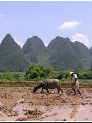 这时,耕牛过完冬季、春节这段舒坦日期后,也要开始投入到春耕生产中来,在春雨绵绵,春意盎然和布谷鸟阵阵的啼鸣中,农民、木犁、耕牛三点一线,像一艘船驶过农田(播稻种),翻滚着泥土的浪花。