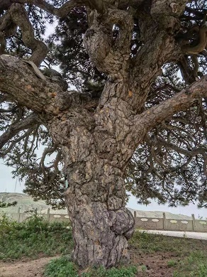 但是,见过了那么多的古树,看了许多写古树的文章,除了心生敬畏,心生感叹,心生喜欢之外,却从来没有把古树和中华民族的图腾“龙”联系起来。但是,在榆林的那棵老油松面前,面对着虬枝苍劲的枝丫,面对着令人震撼的仿若一块块龙鳞一样的树皮,面对着即便是最细的树枝也透出的钢筋一样的坚硬,面对着历经风霜雨雪不畏惧,面对着各种灾难,磨难,困难却绝不屈服,依然坚强活着并且沉静淡然的那棵树,我突然觉得,中华民族的图腾——龙的形象,或许最初就是源自于沧桑古树所给予的某种启示,后人才因此创造出了这样一个龙的图腾。中华龙,可不就是历经风雨磨难,任何困难面前也绝不屈服、任何恶势力面前也绝不退缩、总会顽强地战胜一切敌人并且精彩活下来的这样一个形象?!