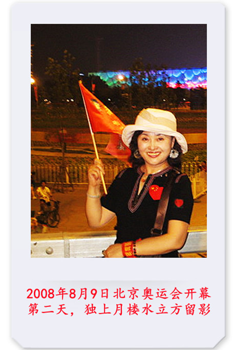 我老人家也按捺不住燃烧的激情:把心形的五星红旗贴在胸前,把“中国加油”的丝带扎在手腕上,手里还挥动着奥运会会旗,每一个POSE都带着最鲜明的奥运热情,譬如,“V”字手势,竖起大拇指等等,整个一个“奥运老太”!