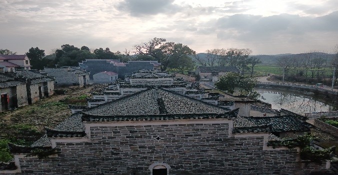 明清古建筑,纵横布局序井然;巷路铺卵石,半千岁月留遗响。青砖黛瓦,民居代有栋梁出;斗室土房,农家不乏翰墨香。书舍号文峰,灯窗曾送书声朗;独特马头墙,朝天五岳傲群芳。坊门铭功德,功彪青史德彰功;知县古宅第,宅映池水鱼游宅。宗祠好气派,雕梁画栋柱擎天;大厦聚人气,耀祖光宗继开来。农家新楼三四层,红瓦银栏亮铮铮。平添古村新气象,传统现代共彰彰。