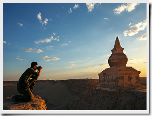 又是凌晨五点起床动身,前往额济纳旗达来库布镇东南25公里处的弱水河东岸。黑城,原为西夏黑水城,元太祖21年(公元1227年)归属蒙古,至元23年(公元185年)在此设置总管府,扩筑了高约十米的城墙,现仍耸立地表。意大利旅行家马可·波罗在他那本著名的游记中,记述了这座城市的繁荣景象。这里是丝绸之路上现存最为完整的一座古城。