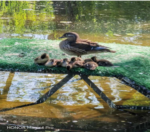 公园工作人员是细心周到的,树洞少,人们就给鸳鸯搭建了挂在树上的小木屋做爱巢,游人禁入区饲养员每天投喂食物,所以这里的鸳鸯还是野性的大自然的宠儿。小鸳鸯满月出飞的时侯,也是摄影爱好者们最兴奋的时候,长枪短炮地几十台专业设备,那阵仗,宛如中央大街举办的新人T台走秀新闻直播现场!当然,也有鸳鸯有时候也会偶尔飞到松花江和太阳岛那边。我在网红桥下拍大白鹭时,就偶遇了他们和夜鹭同框出镜。