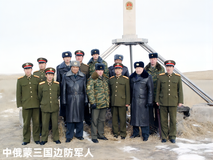 2003年俄罗斯达乌里亚边防总站80周年庆典,俄方边界代表找我方满洲里边界代表张伟智,想借58界点上一块刻着中俄两国文字的大石头一用,我方代表按不可移动的原则予以拒绝。这是三国四方(中方满洲里和阿木古朗)边界代表开会前的合影。