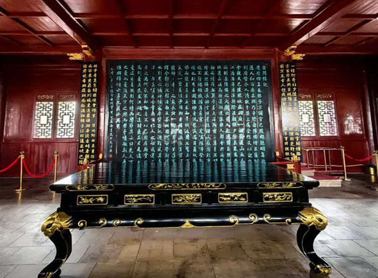 这篇名传千古的《岳阳楼记》,虽字数不多,但字字珠玑,其内容之博大, 哲理之精深, 气势之磅礴, 语言之铿锵, 堪称千古绝唱,倍受文学界的追捧。其中尤以“先天下之忧而忧, 后天下之乐而乐”一句成为千古名言。以后历朝历代的墨客文人虽曾争先恐后来此把酒临风, 登楼吟咏,在此留下大量优美的脍炙人口的诗篇。但唯范仲淹的《岳阳楼记》将岳阳楼的精神内涵推向极致。如今这篇名记由清初书法家张照刻于木雕屏上,存放于楼内。