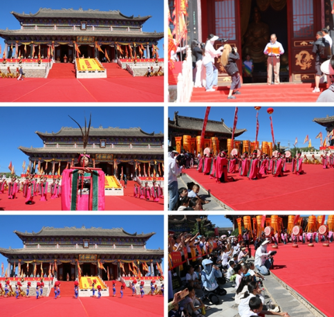 10:00时许,全体肃立起乐、鸣炮、击鼓十一通、鸣钟十响(代表七大洲、四大洋、全世界一亿多李氏族人对陇西李氏先祖无限敬仰),接着由执事开宫门,在圣像前站定行鞠躬礼、拂尘,十二位宫女手捧果盘由仪门至侧门鱼贯而入敬献时果、牢醴馔肴。