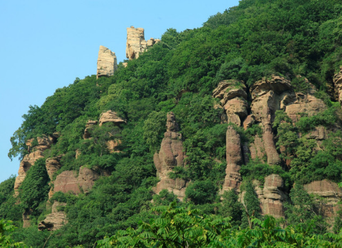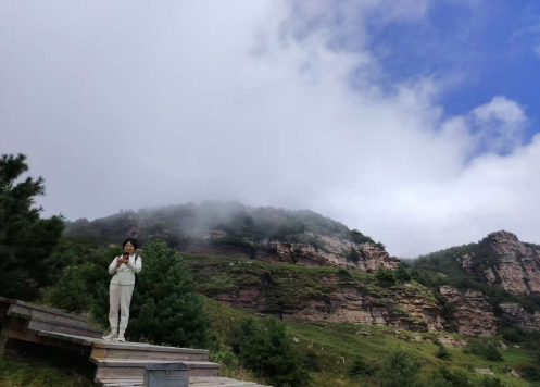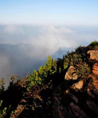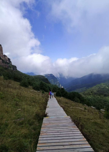 登高望远,南观锯齿崇山32个雄伟山峰,东望云蒙山,白云雾幔,依然萦绕于蓝天山间。我们在云端之上,似乎也轻轻如也,翩翩起飞。云戏山峰间,恍惚人化仙,华北“绿肺”里,心旷神怡巅。