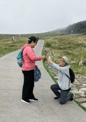 漫步下山,朋友们也许为云雾缭绕燃起浪漫情趣,加之遍地草丛野花引诱,程同志,便采集了鲜艳的野花,羞答答送给妻子。陈老师更是手捧鲜花,单腿下跪,俸给爱妻,在大家的欢呼下,起身飞吻,弥补青春的遗憾。我们六人欢呼雀跃,笑声回荡山间,掌声震荡落叶,周围游客受我们影响,驻足观赏,投来羡慕和微笑。