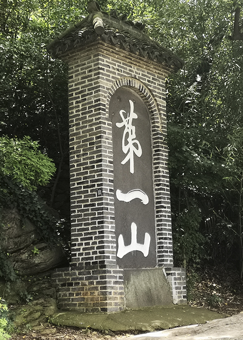往前走,大家才看到真正古老的“第一山”碑刻。碑体为黑色,字为百色,黑白鲜明。碑刻顶部为拱形,由青砖镶嵌,上盖小坡顶。据书家言,“第一山”三个字为“簪花家法”,行书,勒为阴刻。这“第一山”碑刻也如山名一样有段传奇故事。