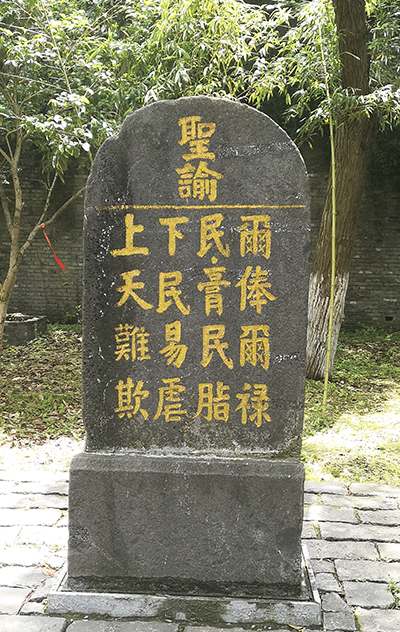 沿小道登山,一块空地上的“戒石碑”引人注目,碑上刻的是宋太宗赵光义(赵炅)颁布的廉政令:“尔俸尔禄,民膏民脂,下民易虐,上天难欺。”碑文题头是“圣谕”二字。这十六个字简单明了,寓意深刻。我看了心生感动,特别是“下民易虐,上天难欺”八个字,令人震撼,犹如看见赵光义在大声呵斥那些贪官腐吏。我想,这应当为历代官员的座右铭。当代官员不妨多来看看,或许也能触动一下灵魂。