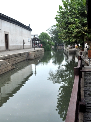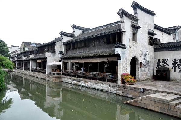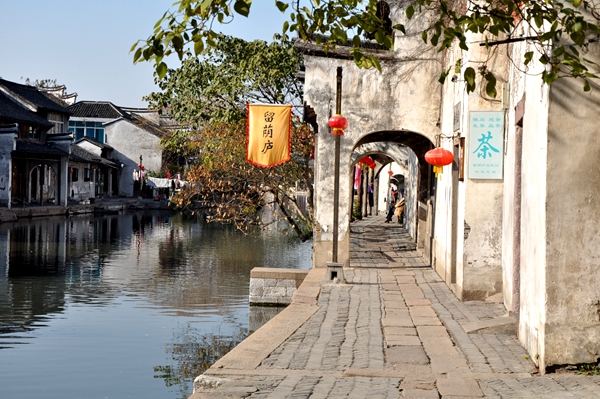 无精打彩地拖着拉杆箱顺河寻找住宿之处,如果不是天黑和没车,恐怕转身返回上海了。忽见有“留荫庐”的酒旗迎风摆动,是饭店还是客栈?反正两项都是眼下的急需。上前拉起木门上的铁环,轻扣了三下。一位中年男人应声而出,热情地招呼道:“请进!”进得门来,不知如何下脚。空间很狭小,好似农家小院,又像微缩园林,还如宾馆大堂。一个过道串着两个花园。前面有小桥流水、假山真草、老式家俱和名人字画,后面有凉亭、茶台和柚子树。客房仅有几间,英式门锁,雕花大床,隔窗见河,犹居水上。从来没住过如此这般的客栈,当即决定体验一下。