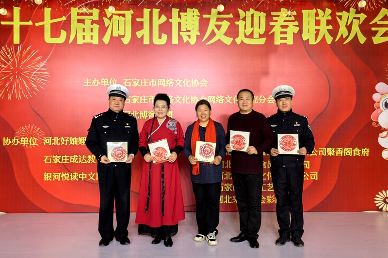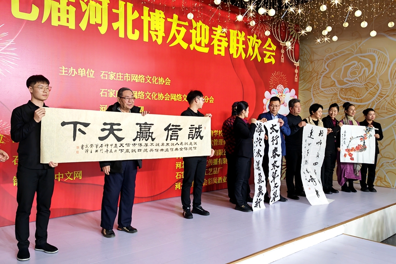 出席春晚并捐赠书画作品的书画家有:冯栋梁、王世成、武峰、路继舜、李东顺、梅子、沐澜、苟志俊,贾勇伟、申盛林、于礼谦、许生,特别是苟志俊,贾勇伟、申盛林、于礼谦、许生等不但捐赠作品,还主动在现场写春联。诗人梁剑章捐赠了100多本自己的诗集,石家庄市网络文化协会捐赠100本《品味西柏坡》,作家梅子在现场还将自己的小说《黑白门》签名赠书。