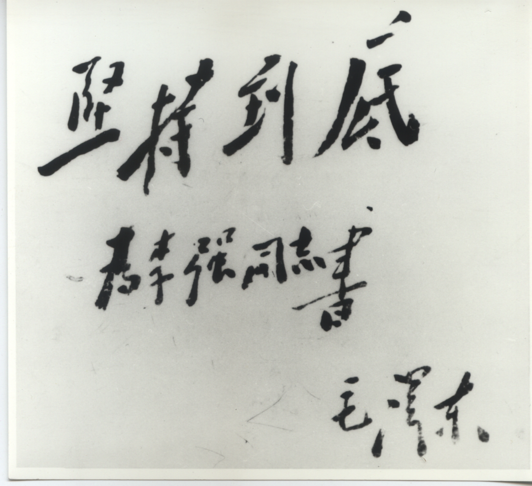 1944年5月,李强在陕甘宁边区职工代表大会上被授予“特等劳动模范”荣誉称号,毛泽东主席为他亲笔题词“坚持到底”。