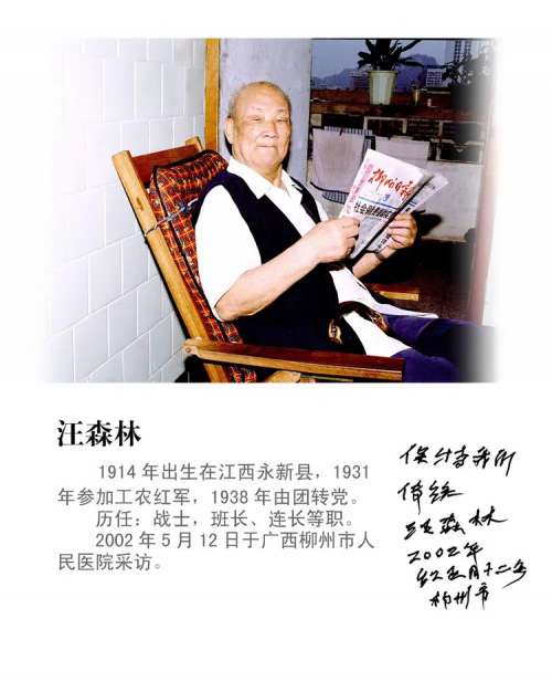 当我回到住院部时,天色巳很晚,赶紧支好三脚架,拍了几张汪老的照片,因太阳下山太快,光线较暗,只好抱谦地说:“汪老,我明天早上再过来重新拍几张。”收拾好设备,汪森林儿子汪建潮也来到病房,我俩一起问起了汪老当年革命、长征的情况。