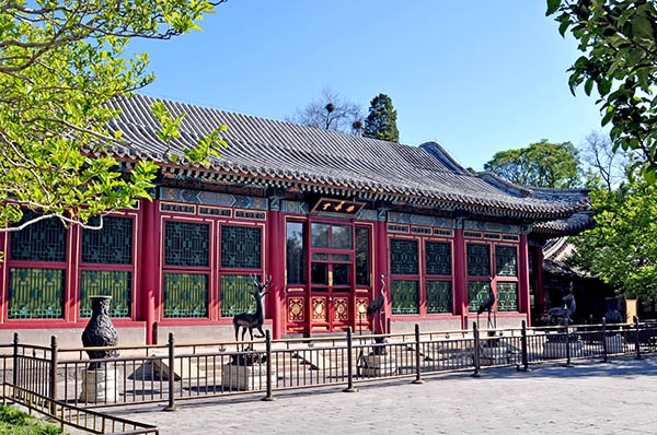 进入乐寿堂,我看到这是一组前后两进、左右各带跨院的四合院式建筑群。大殿红柱灰顶,造型别致。在乐寿堂阶前,对称摆放着铜铸的鹿、鹤与宝瓶,取“六合平安”之寓意。屋内,还陈列着宝座、御案、香炉等物品。东厢房是更衣室、西厢房是卧室,房中还有一扇高两米、宽一米多的“百鸟朝凤”的粤绣屏风,做工极为精细,百鸟栩栩如生,堪称国宝,深得慈禧太后的喜爱。据说,这样的摆设,完全是当年的原貌。这里面对烟波浩淼的昆明湖,背靠万寿山,环境十分幽雅。东面是德和园大戏楼,从北面上山,可以到景福阁。乐寿堂与长廊相联,是休闲散步的绝佳去处。难怪乾隆的母亲、后来的慈禧太后,都来颐和园选择此院居住。