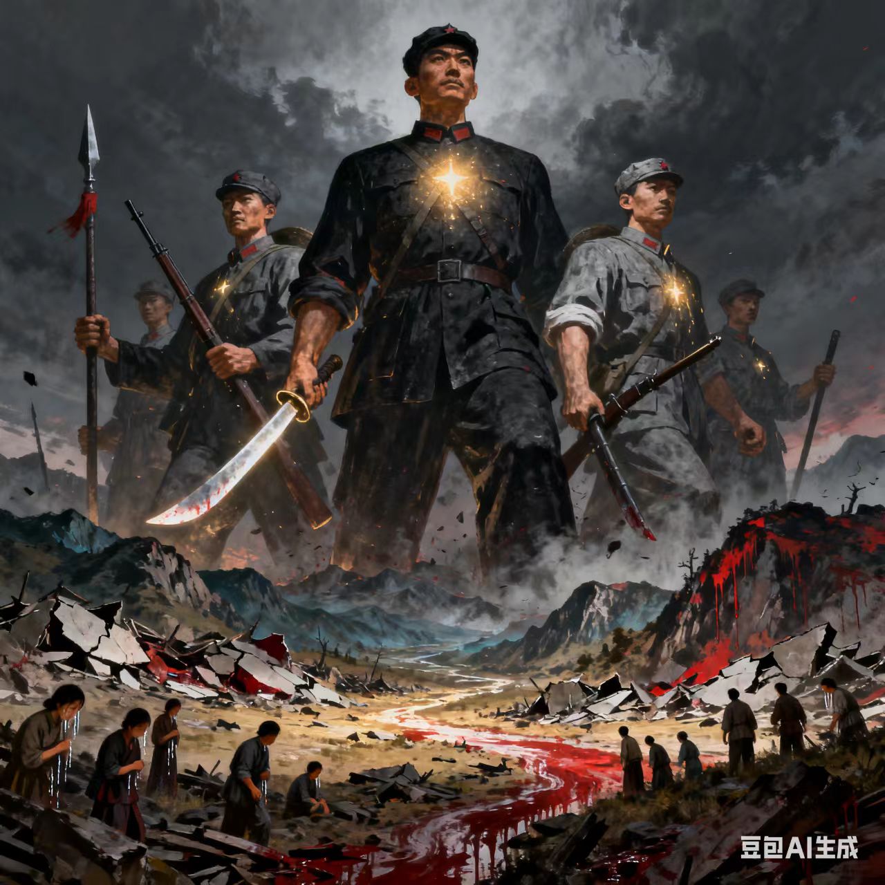 忽然,远处又滚过几阵雷声,不,那不是雷声,那是隆隆的枪炮声——是日本关东军侵占东北,杀戮千千万万同胞的枪炮声,是疯狂成性残无人道的日寇把我大好河山变成一片焦土的罪恶行径,是北平城中东江城中,愤怒的学生和民众震天动地的怒吼声,是一支支抗日义勇军战斗在白山黑水浴血杀敌的枪林弹雨,是千千万万中华儿女用长枪和刺刀对侵略者书写的战表,是千千万万军人告别老母亲和妻儿时,发下的不赶走日寇决不回还的誓言......