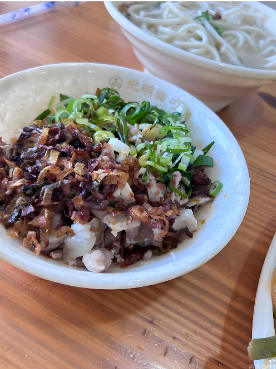 很快,面上来了,是那种很家常的手擀面,像乌冬面一样圆墩墩的,不似市上常见的拉面那样硬。软面对脾胃很友好,再倒入浓浓的骨汤,上面撒上一层过了油的葱花蒜末,香气四溢。那一小碗叉肉,也叫剔骨肉,有些地方也叫拆骨肉,瘦肉带着筋,炖得软硬刚好,既不会过分软烂失了Q弹口感,而牙口不太好的人也完全咬得动,肉的上面也是撒一层过了油的葱花蒜末,底下是调料,拿筷子拌上一拌,再送一块入口,嚯!瘦肉香、筋头香、蒜香、葱香、油香,混合着充满了整个口腔和鼻腔……足矣,足矣,夫复何求!