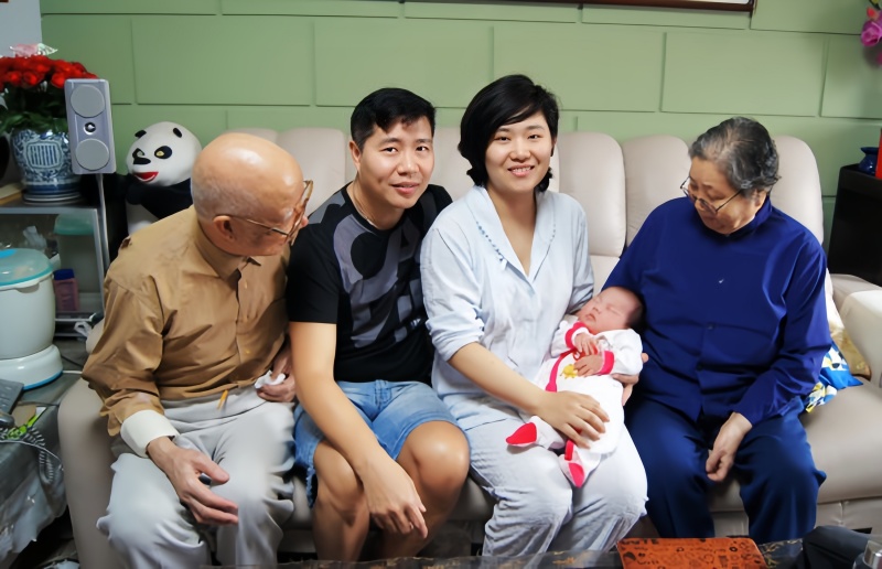 酣睡的芽芽(可心)与爷爷(左一)奶奶(右二)姥姥(左二)姥爷(右一)妈妈(左三)在一起