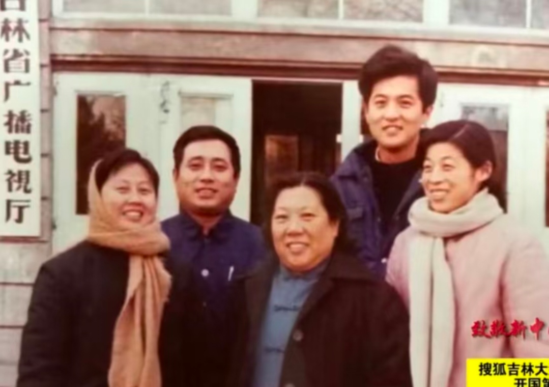 (杨晓明(左二)在省电台门前,与社教部领导、同事合影。)