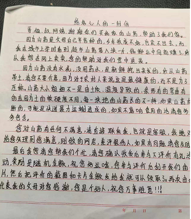 这箱山药,看上去品相还不错,吃起来口感也好。夫人在纸箱下面见到一封信。有年头没看过手写的书信了,眼前一亮。显然,信是一个孩子写的,很工整的学生体:给好人的一封信。猜不出是男孩还是女孩写的,可以肯定是个好孩子写的。开头就说:“谢谢你们卖我们家的山药,帮助了我们家。因为山药是我父母自己辛苦种的,今年收成不好,也卖不出去。而我在城里上学,看见超市里山药要8块一斤,钱让中间商赚了。所以,我想在网上卖卖,您的帮助对我们是雪中送炭。”