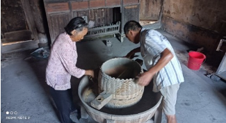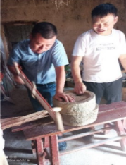 条糯一般用砻盘砻成糙米,没有砻盘的农户也会用碾米机做成糙米,也就是成米只去除谷壳,保留米皮,才不至于蒸酒、榨酒时糯饭、糟皮变糊,影响酒质与“看相”。