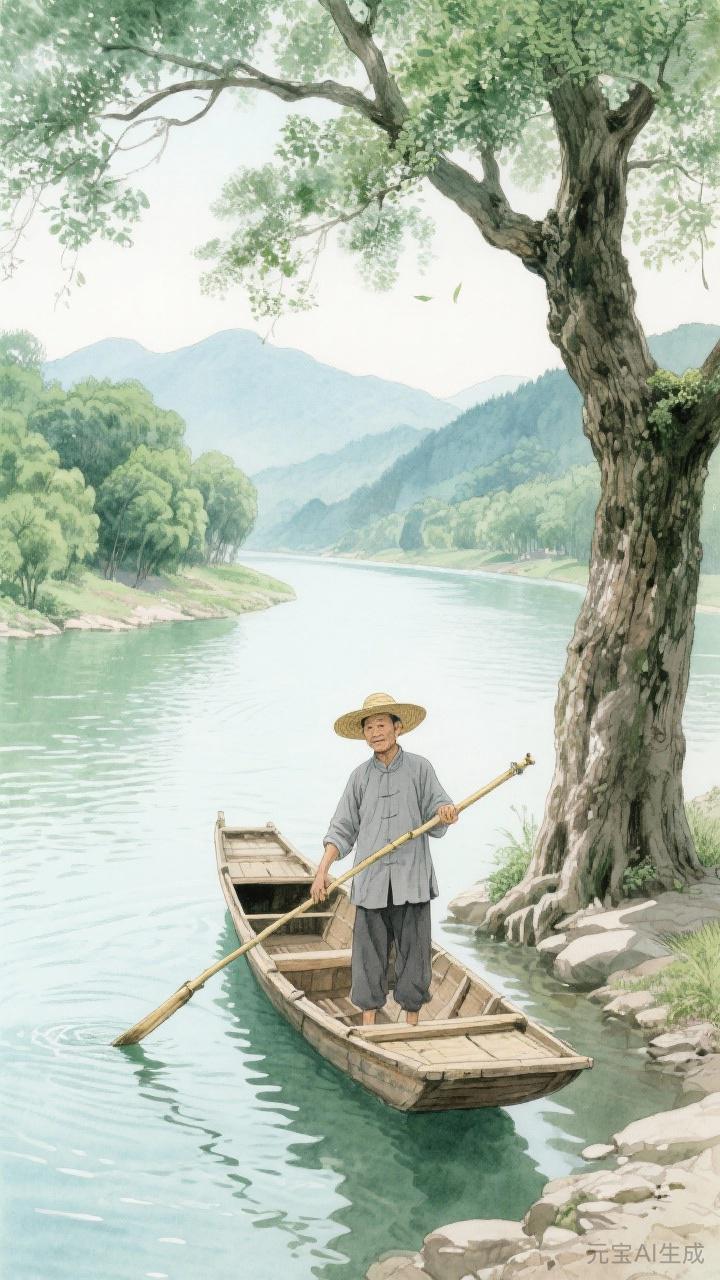 张大爷慢悠悠地把船划回了老渡头,将船栓在老槐树下。老槐树的枝叶繁茂,像一把巨大的绿伞,为老渡头遮风挡雨。树影投在江面上,随着江水轻轻晃动,晃得像幅还未干透的水墨画,美得令人陶醉。那水墨画中,有树影的斑驳,有江水的涟漪,仿佛在诉说着老渡头的故事。