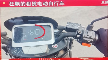 “狂飙的租赁电动自行车”:肆意违反电动自行车时速不能超过25公里的国家标准与电池组标示值不应超过48伏的国家标准,甚至将摩托车伪造成电动自行车,存在很大的交通与生命安全隐患。