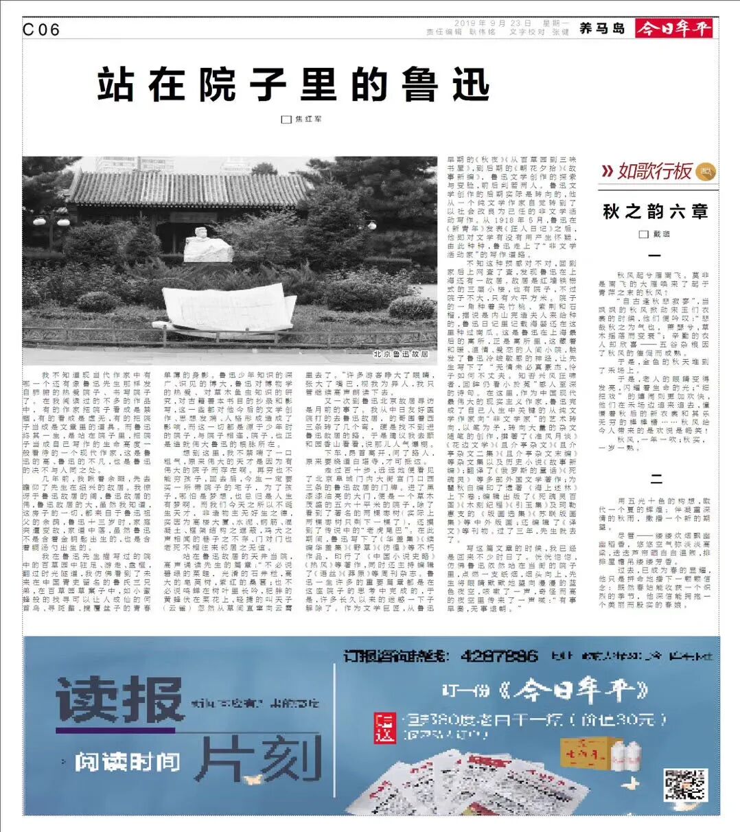 且看他解读了哪些名家呢?分别是鲁迅、冰心、张中行、季羡林、任继愈、王小波、张炜等人。这些人无疑是现当代具有赫赫威名的大家。按说,解读他们的作品早已经是汗牛充栋,想写出新意何其艰难!但新意就是想别人所未想、发别人所未发。首先看鲁迅,焦红军写出一篇题为《站在院子里的鲁迅》的散文。众所周知,我们熟知鲁迅的形象多是坐着,大先生神情肃穆,望着镜头。站着也有,多是手里拿着正在点燃的香烟,头发根根直立,恰如他坚韧挺拔的精神。