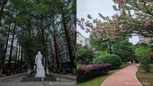 林荫道上,高树参天,树影如盖,白衣雕像静立其间,像在守护着这一方岁月静好。风穿林而过,叶声沙沙,把城市的喧嚣都挡在园外。转角处,晚樱开得正好,粉云垂落,铺满了归家的路。步道蜿蜒,有老人散步闲谈,有孩童追着春光奔跑,长椅上有人静坐看花,把春天走成了最寻常的浪漫。
