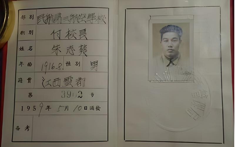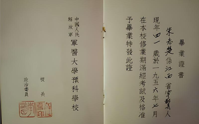 图为1956年7月朱志楚就读的军医大学预科学校的毕业证书
