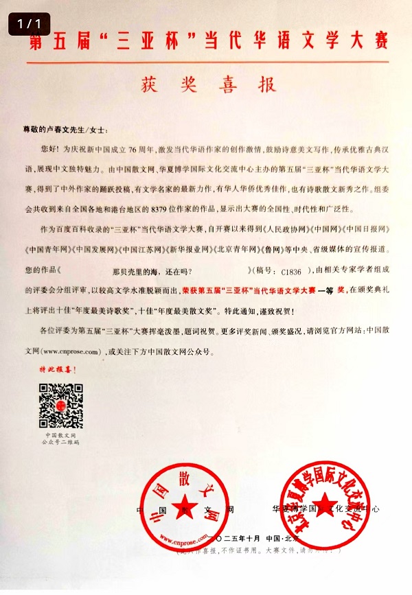 【银河喜讯】祝贺银河文友卢春文作品两次获得征文奖!