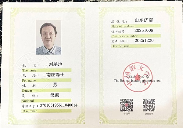 【作者简介】南庄隐士,本名刘基地,下过乡,当过兵,经过商,从过政。上过济南军区陆军学院,毕业于曲阜师范大学中文系。曾为《中国水利报》《大众日报》《济南日报》等报刋优秀通讯员。先后在《人民日报》《解放军报》《文汇报》《大众日报》《齐鲁晚报》等多家报刊杂志发表千篇稿件并多次获奖。其中,言论《排队》获人民日报征文三等奖,散文《战地照里有一段温謦的故事》获齐鲁晚报征文一等奖,《情人大世界》获济南日报社会生活征文一等奖。报告文学《山腰间那栋小屋》、小说《水去水又回》分别获首届,第二届水利文学作品优秀奖。近年热衷于网络文学论坛,曾活跃河北博客圈,《处分没有公布》在长城网征文获二等奖,《我的酒故事》获三等奖。走进银河悦读网后,《寻找编辑部金花》在“中华巾帼风采”征文获三等奖,《我的大中国》获得第二届“退休后的精彩生活征文”三等奖。现为山东省散文学会会员,青年文学家杂志社理事,优秀作家和《济南日报》市民记者、《舜网》银河悦读中文网驻站作家。2022初年和2023年初连续两年被银河悦读网站评为金牌作者。