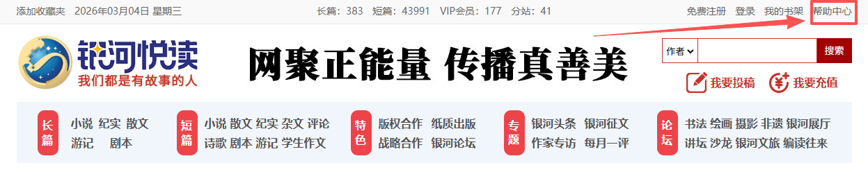 1. 宗旨置顶。这是网站的魂。将“网聚正能量 传播真善美”办站宗旨置于网站核心位置,彰显作为“红色网络文学领跑者”的银河悦读网,全力“传承红色基因、传承中国精神、传承中华优秀传统文化”的使命担当。
