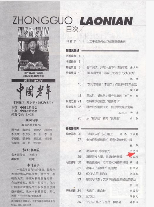 祝贺忠田老师银河佳作《老有所为 为国增光》刊于《中国老年》杂志2026年4月上半月版