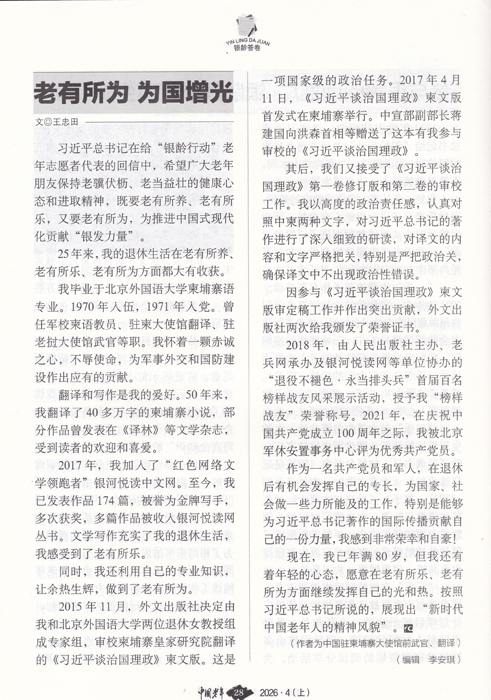 祝贺退休武官王忠田银河佳作《老有所为 为国增光》刊于《中国老年》杂志2026年4月上半月版