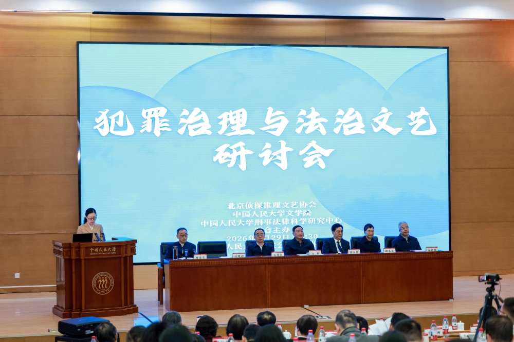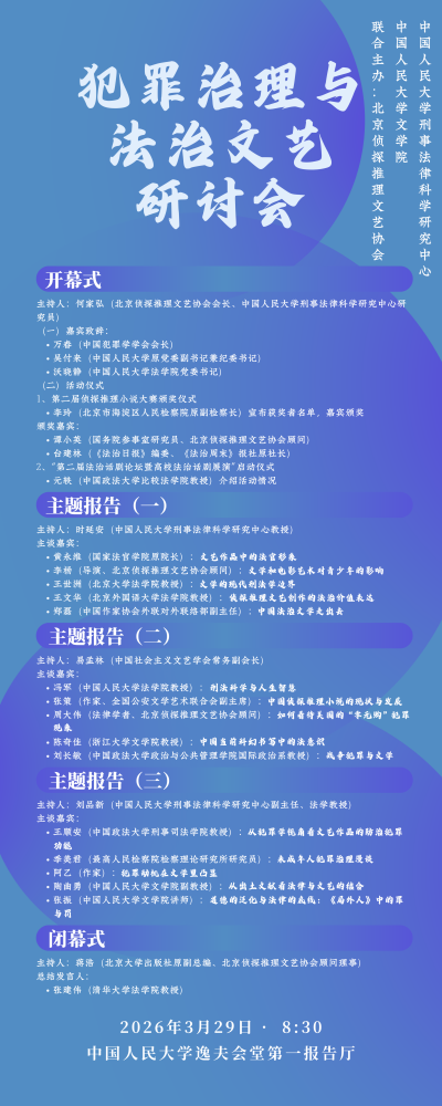 法治建设既需要制度规范的刚性约束,也需要文艺作品的柔性浸润。犯罪治理作为社会治理的重要组成部分,其理论研究与实践探索离不开法治文艺的传播推广;而法治文艺创作要实现以案释法、以文化人的功能,也必须植根于犯罪治理的现实土壤。推动法学研究与文艺创作的深度融合,探索犯罪治理系统运作规律与法治文艺创作表演特点的互动关系,对于提升全民法治意识、推进法治中国建设具有重要意义。为深化犯罪治理理论研究,促进法治文艺繁荣发展,搭建法学界与文艺界交流对话平台,中国人民大学刑事法律科学研究中心与北京侦探推理文艺协会于 2026 年 3 月 29 日在中国人民大学逸夫会堂联合主办 “犯罪治理与法治文艺研讨会”。有关单位领导出席了开幕式,法学界和文学界的专家学者、作家导演从不同视角展开了深入研讨。会议期间还举行了第二届“周泰杯”侦探推理小说大赛颁奖仪式和第二届全国法治话剧进高校活动启动仪式。——引自主办单位会议通知