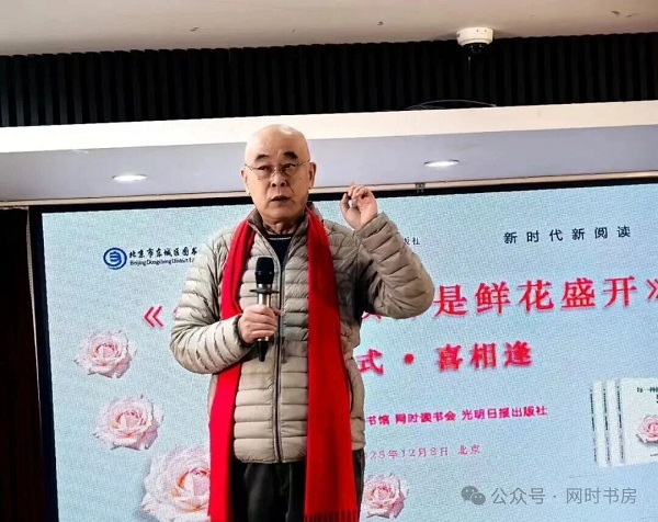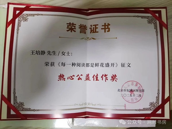 2025年12月8日下午,准时到北京东城区图书馆参加《每一种阅读都是鲜花盛开》首发式。一进会议室,人声鼎沸,好不热闹。首发式开始,李会长一说话,大家立马安静了下来。颁奖环节,意外之喜,我获得了“热心公益佳作奖”,当戴着红围巾上台领奖时,心里还有些小激动。