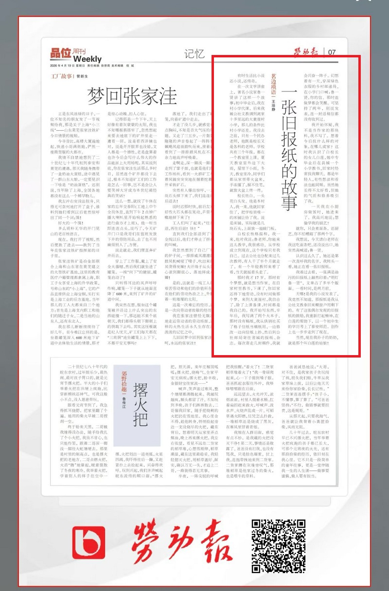 祝贺银河悦读驻站作家王培静佳作《一张旧报纸的故事》刊登《劳动报》