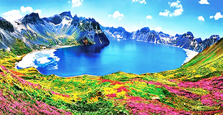 爬过几处高坡,远处环抱天池的高耸峰巅闯入眼帘。近处圆弧形的高山草甸上铺满了地毯般的绿茵,五颜六色的山花点缀其间。这里就是东北地区海拔最高最美的花海“高山花园”,也叫“空中花园”,是东北亚唯一原始高山植被的宝库。游人把高山花园十个各有特色的花园,分别起名为鸢尾园、杜鹃园、黎芦园、松桦园、南花园、金莲园、岳桦园、蓝花园、虎背园、王池园。其中的鸢尾花园位于海拔1400米左右的林间草地区域,主要生长着各种鸢尾花,花色多以篮紫色为主。法国人视鸢尾为国花,在拉丁语中又叫“艾丽丝”,希腊神话中把它奉为“彩虹女神”。每年的7、8月份乃是这里最美的季节,站在这里放眼望去,整个山坡铺上了一层层厚厚的花毯,漫山遍野宛若花的海洋,人间天堂。其花色和品种随着季节的变化而变化,春天一般开白花和黄花,夏天开蓝花和紫花,雍容华贵的高山杜鹃,洁白无暇的高山罂粟,更有各种我根本叫不上名的奇花异草争相吐艳芬芳,千娇百媚,令所有到此的游客无不因走进仙界而心花怒放、流连忘返。