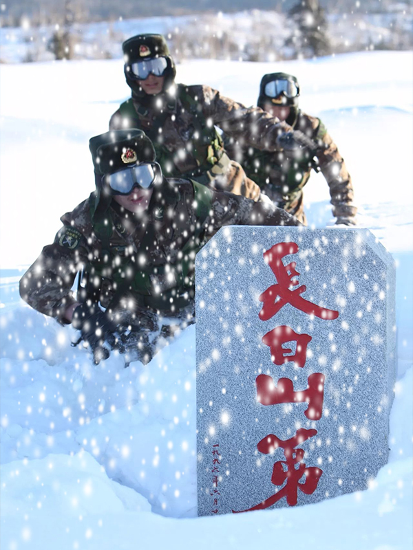 ”风吹石头跑,氧气吃不饱,六月春来早,九月大雪飘”......长白山的边防线上,气温最低零下52℃,常有8-10级大风,暴雪飞扬,寒风透骨,大雪没膝......所有这一切,都挡不住战士们用冻伤的双脚,坚定而有力地丈量着每一寸边境线的意志。皑皑的雪地上印出的,是他们出门巡逻奔赴哨位的深深足迹;铿锵的节奏是他们嚓嚓、嚓嚓踏雪的声音;寒风的呼啸是为他们的行进伴奏的乐曲;雪花的漫天飞舞是他们身边最美的陪伴;涉险攀绝是他们家常饭一样的行程;餐风露宿忍受寂寞孤独是他们日常循环往复的生活;枕戈达旦是他们肩负的最神圣的使命。春夏秋冬,三百六十五天,在祖国东北的边防线上,在人迹罕至的长白山巅,在距太阳更近的地方,白天,强紫外线授予他们特殊的勋章——“太阳色”;或寒或暖的夜里,肆虐的蚊虫,凛冽的山风伴他们孤独的细数流星。单一而又重复,艰苦而又重要。为山河无恙,为万家皆安,他们初心如磐,肩扛责任,剑指边关,壮行天涯,笑卧冰雪,涉险攀绝,无怨无悔,不辱使命。用太多太多超越我们想象力的情节,构成了一位位无名边防军人的每一天。他们用生命巡逻边防线,守护着祖国的国门!界碑象征着的是祖国的尊严!每一位边防军人心中都有一个共同的信念:“长白山上练虎胆,迎风傲雪筑防线”,“宁肯白山埋忠骨,不丢祖国半寸土”。