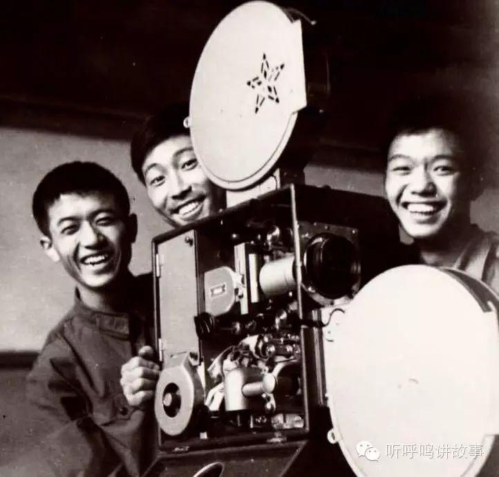 (这是我们电影组的男兵,摄于1978年。(右起)王谊冰,张百鸣,张琪。这是一部35毫米移动式的放映机。)