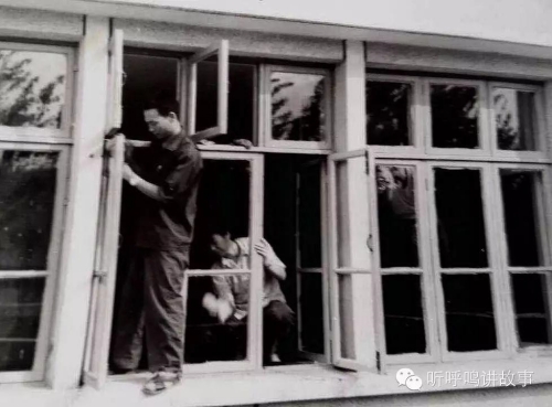 (这是当年,政治处的高昌树主任和冀春亚干事在擦我们"天天读"大屋的玻璃,离窗外两米多的大杨树下就是我秘密藏广播室钥匙的宝地。)