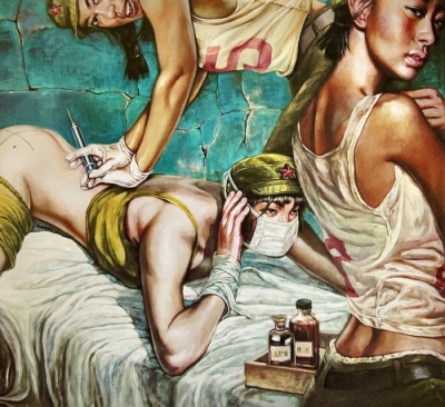 我推着注射车紧跟着徐护士来到了四病室。这是一个大病房住着八九个病人,徐护士拍着手大喊:“哎,注意!各就各位。”她拿起注射名单念道:“8床、9床、11床、14床把裤子脱了!一律趴好!不许说笑!”真神了,那些男病号没有一句废话。徐护士消毒、进针、推药、拔针,绝对是三快。没用半分钟,肌肉注射完成,往病号的屁股上啪地一拍说:“走你,下一个9床!”9床小声地说:“徐护士能慢点吗?我有点……”徐护士笑了:“你有点嘛?就你事多,一不怕苦,二不怕死,你是怎么学的?”徐护士又啪地一声打到了他的屁股上,随后一针下去,9床哎哟了一声。徐护士已经把针拔了出来。随后又啪啪打了9床两下,笑着对我说:“学会了吧?下个你来!”我走到11床前,按照操作规程一步步地进行。当我一边推药,一边用中指在病人皮肤上轻划分散病人的注意力时,徐护士突然大笑起来。