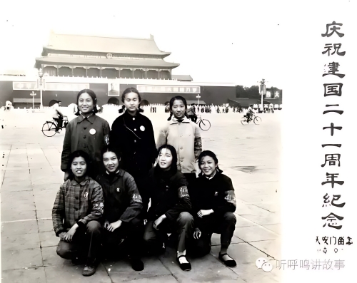 (这是我们二附中文艺宣传队部分队员(我在前排左三),七人合影中我只记得三个人的名字。前排左一:徐湘桐,左四:商春风,后排左二:江南。在建国二十一周年国庆期间我们在天安门广场合影留念。)